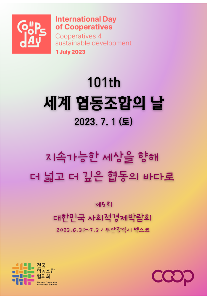 오는 7월 1일, 토요일은 101번째 세계 협동조합의 날입니다. (매년 7월 첫번째 토요일) 특히, 올해 세계 협동조합의 날은 "지속가능한 세상을 향해 더 넓고 더 깊은 협동의 바다로" 상상하고 협동하며 행동하는 협동조합의 사회적 역할에 주목하고 있습니다.