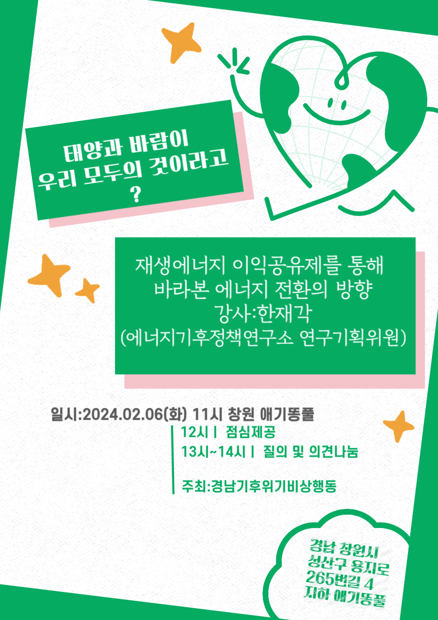 | 기후위기 시대, 어떻게 살아야 하나요? (조합 10주년 특강: 오기출 푸른아시아 상임이사 2023.11.10 (금) 15:00-18:00, 창원대) (2) | 2023.11.01 |