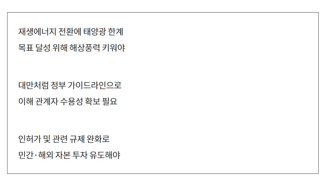 2024년 우리나라의 전체 에너지 수급에서 재생에너지가 차지하는 비중은 10.6%였다. 올해 제11차 전력수급기본계획에서는 2030년까지 재생에너지 비중을 21.8%로 높일 계획이다. 그동안 우리나라에서는 설치가 쉬운 태양광 중심으로 재생에너지가 보급됐다. 그러나 중국산 태양광 패널이 국내 시장을 잠식하며 에너지 안보를 위협하고 있다는 우려가 제기되고, 태양광을 설치할 만한 입지도 고갈되고 있다. 재생에너지로의 전환은 해상풍력 중심으로 이루어질 수밖에 없는 상황이다.