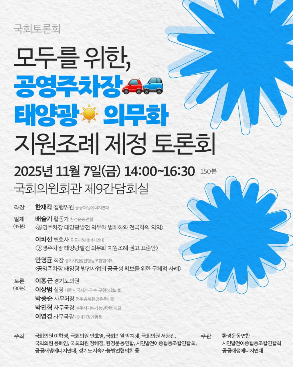 공영주차장 태양광 발전 의무화 지원조례 제정 토론회를 개최합니다.