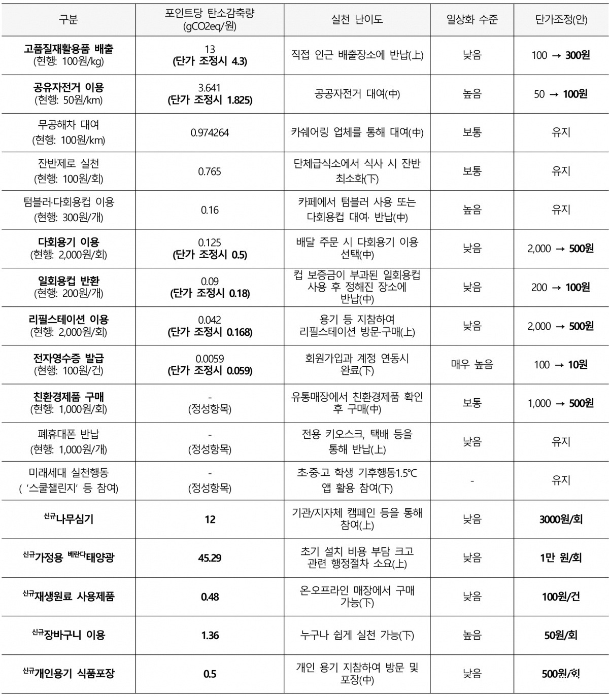 개선안에 따르면 기존 항목별 단가를 실천항목별 탄소감축량, 일상화 수준, 실천 난이도 등을 종합적으로 고려해 단가를 조정한다. 예로 탄소감축량이 높고 실천난이도가 높은 ‘고품질재활용품 배출’ 항목은 단가를 100원에서 300원으로 상향한다. 탄소감축량이 높은 ‘공유자전거 이용’도 50원에서 100원으로 상향한다. 탄소감축량이 낮고, 일상화 수준이 높은 ‘전자영수증 발급’ 단가를 100원에서 10원으로 하향한다. 탄소감축량 등이 낮은 ▲다회용기 이용(2000원→500원) ▲일회용컵 반환(200원→100원) ▲리필스테이션 이용(2000원→500원) ▲친환경제품 구매(1000원→500원) 등의 항목도 단가를 하향 조정한다.