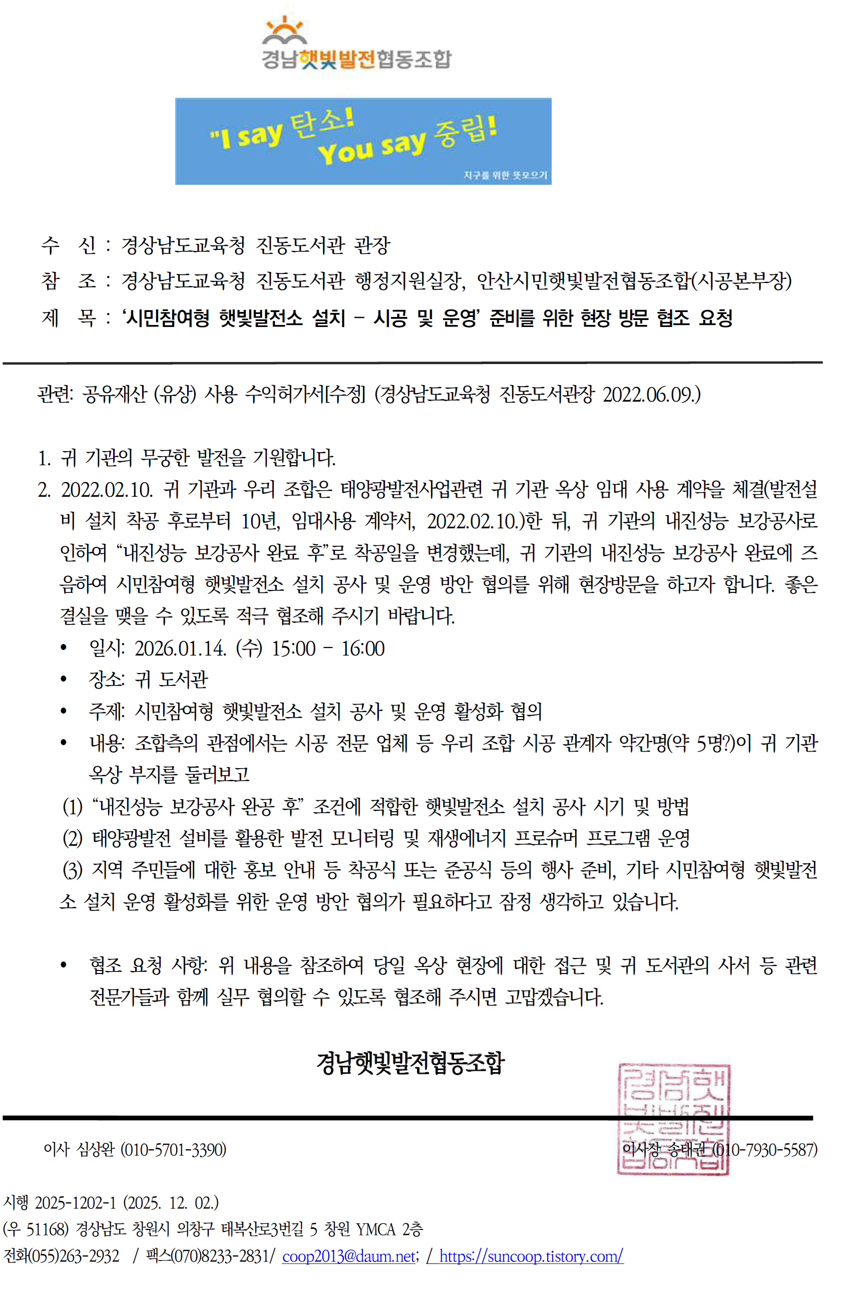 | 진동도서관 옥상에 조합 6호기 '시민참여형 햇빛발전소 설치 - 시공 및 운영' 준비 위한 현장 방문 2026.01.14. (수) 15:00 (0) | 2025.12.03 |