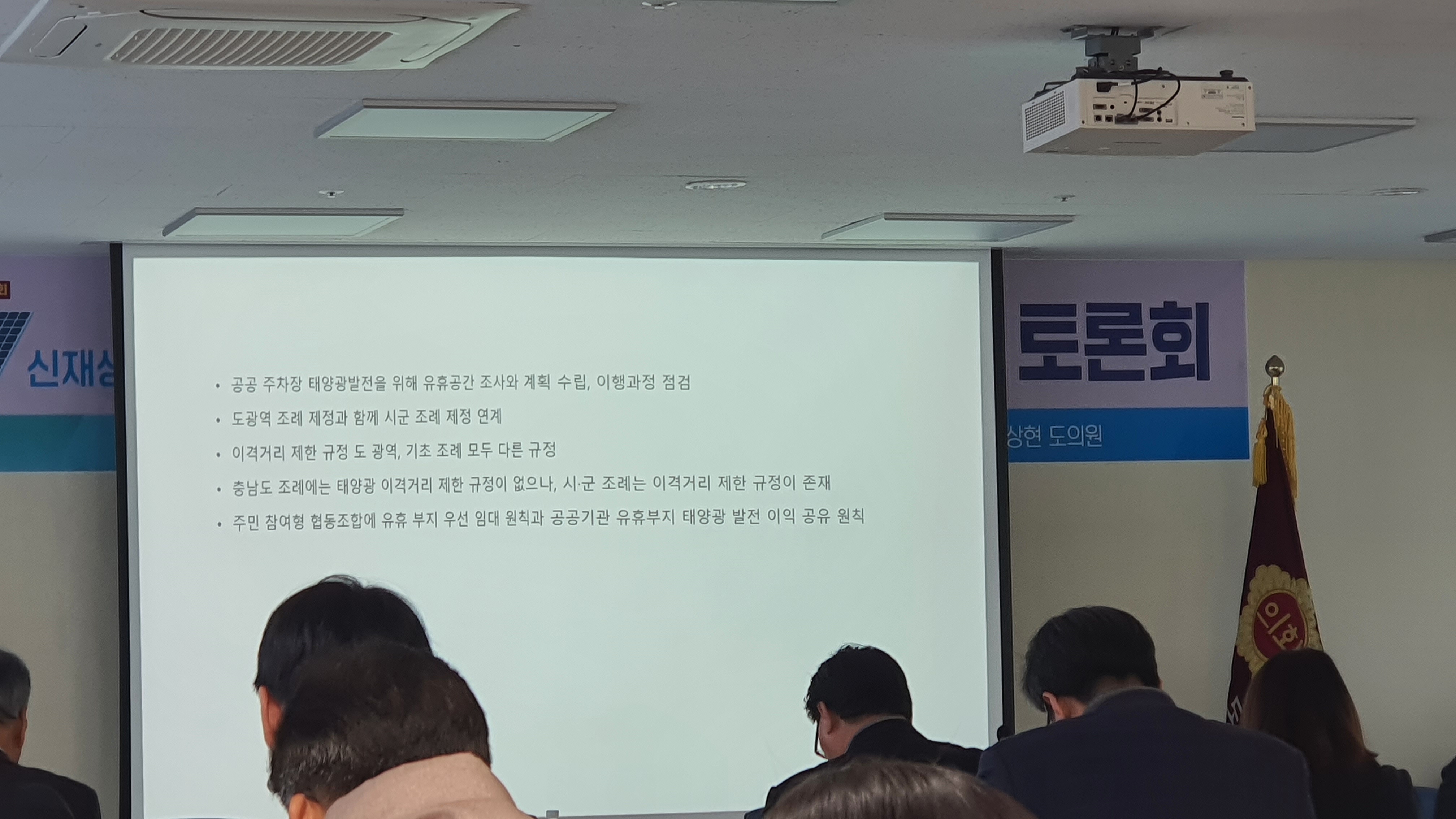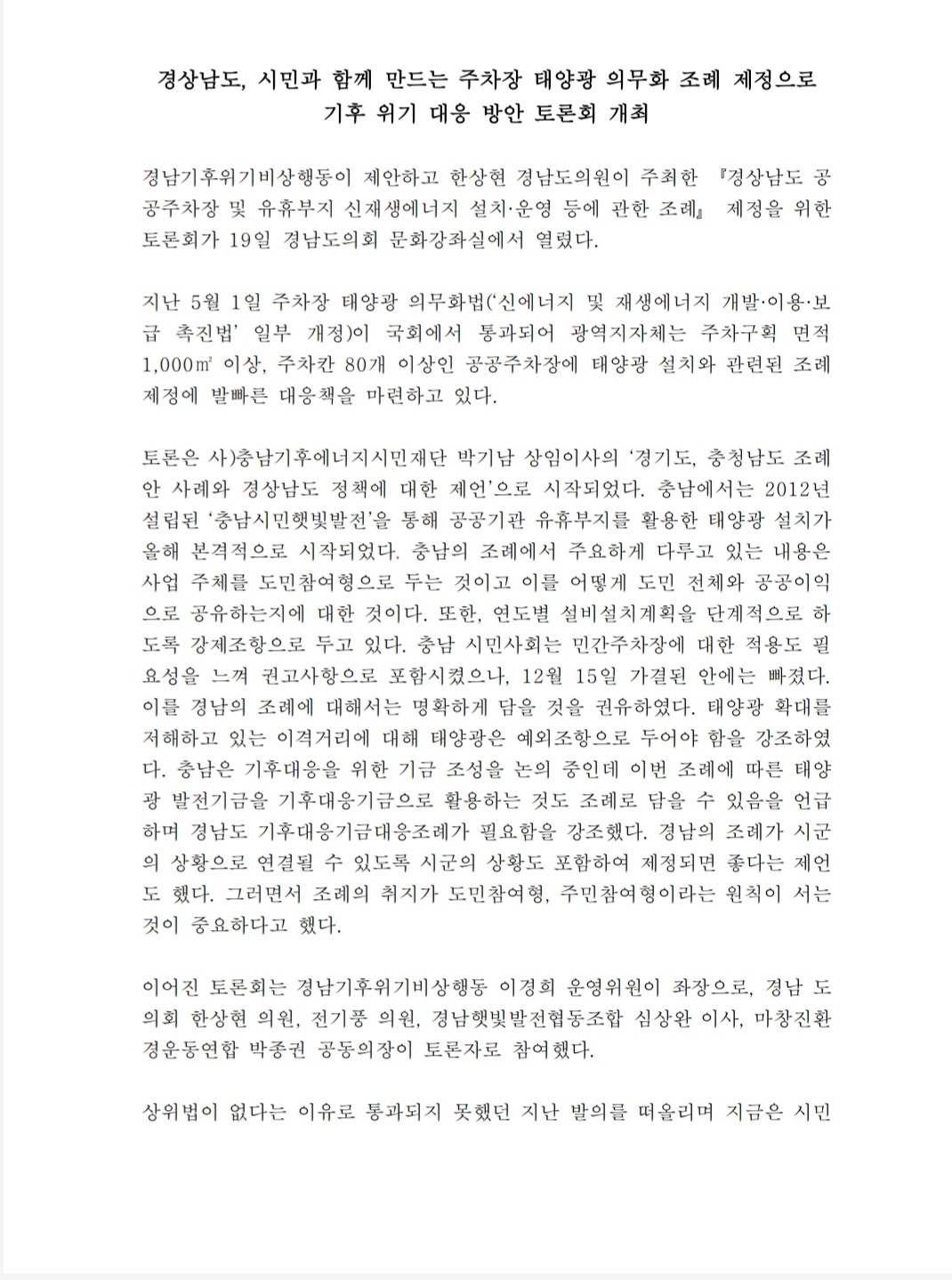 경남기후위기비상행동이 제안하고 한상현 경남도의원이 주최한 『경상남도 공공주차장 및 유휴부지 신재생에너지 설치 · 운영 등에 관한 조례』 제정을 위한 토론회가 19 일 경남도의회 문화강좌실에서 열렸다. 지난 5 월 1일 주차장 태양광 의무화법(‘신에너지 및 재생에너지 개발·이용·보급 촉진법' 일부 개정)이 국회에서 통과되어 광역지자체는 주차구획 면적 1,000m' 이상, 주차칸 80 개 이상인 공공주차장에 태양광 설치와 관련된 조례 제정에 발빠른 대응책을 마련하고 있다.