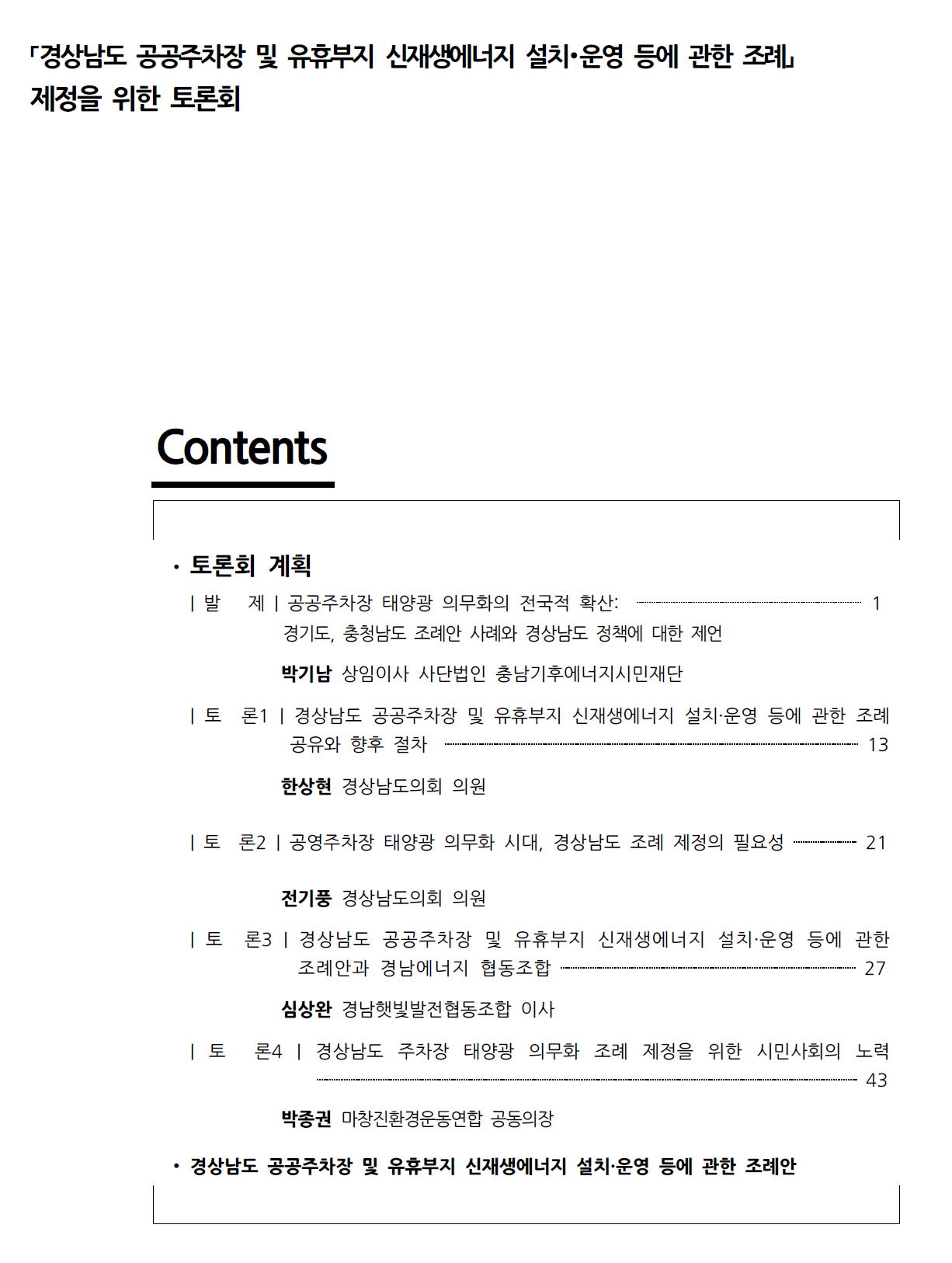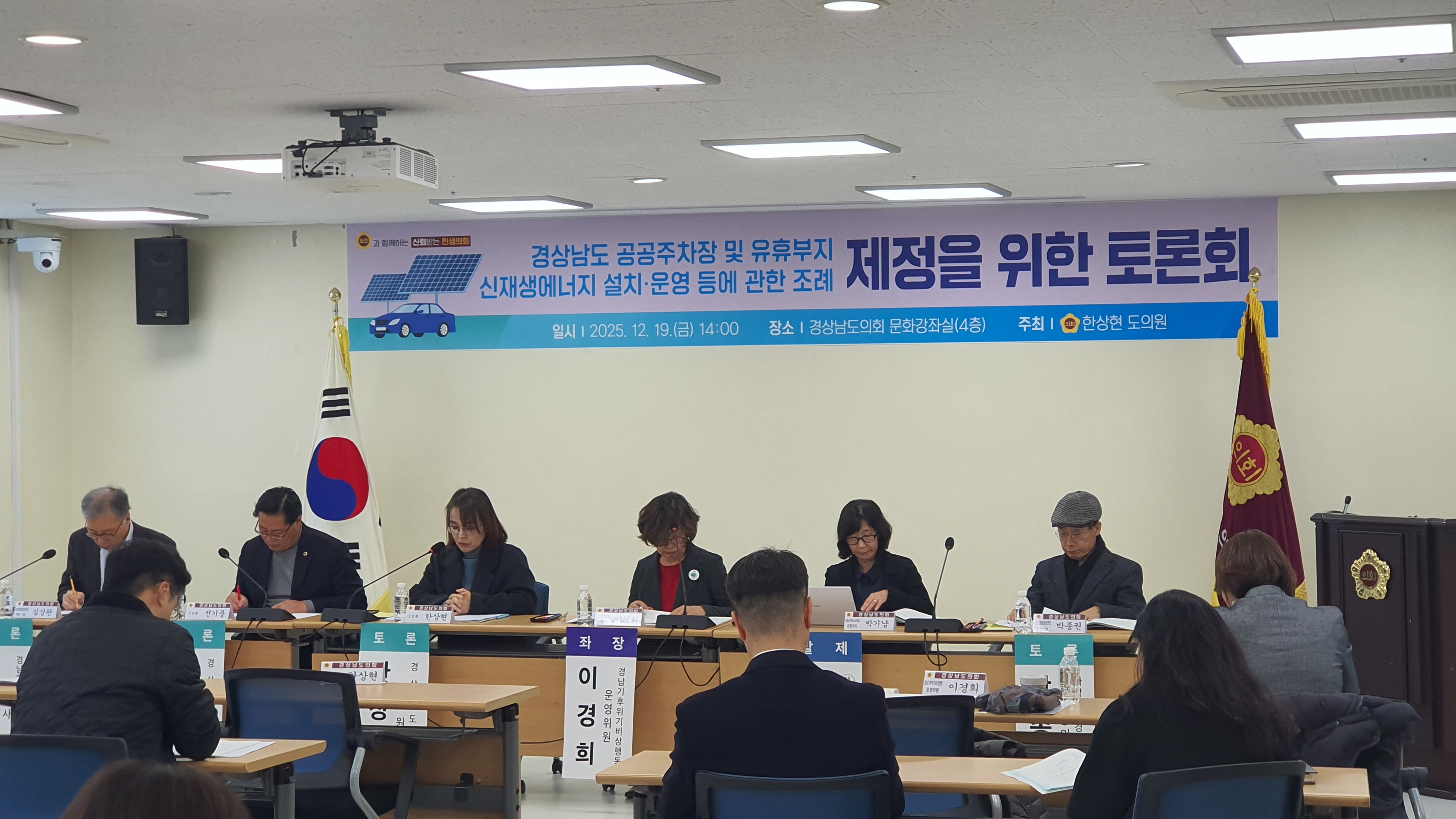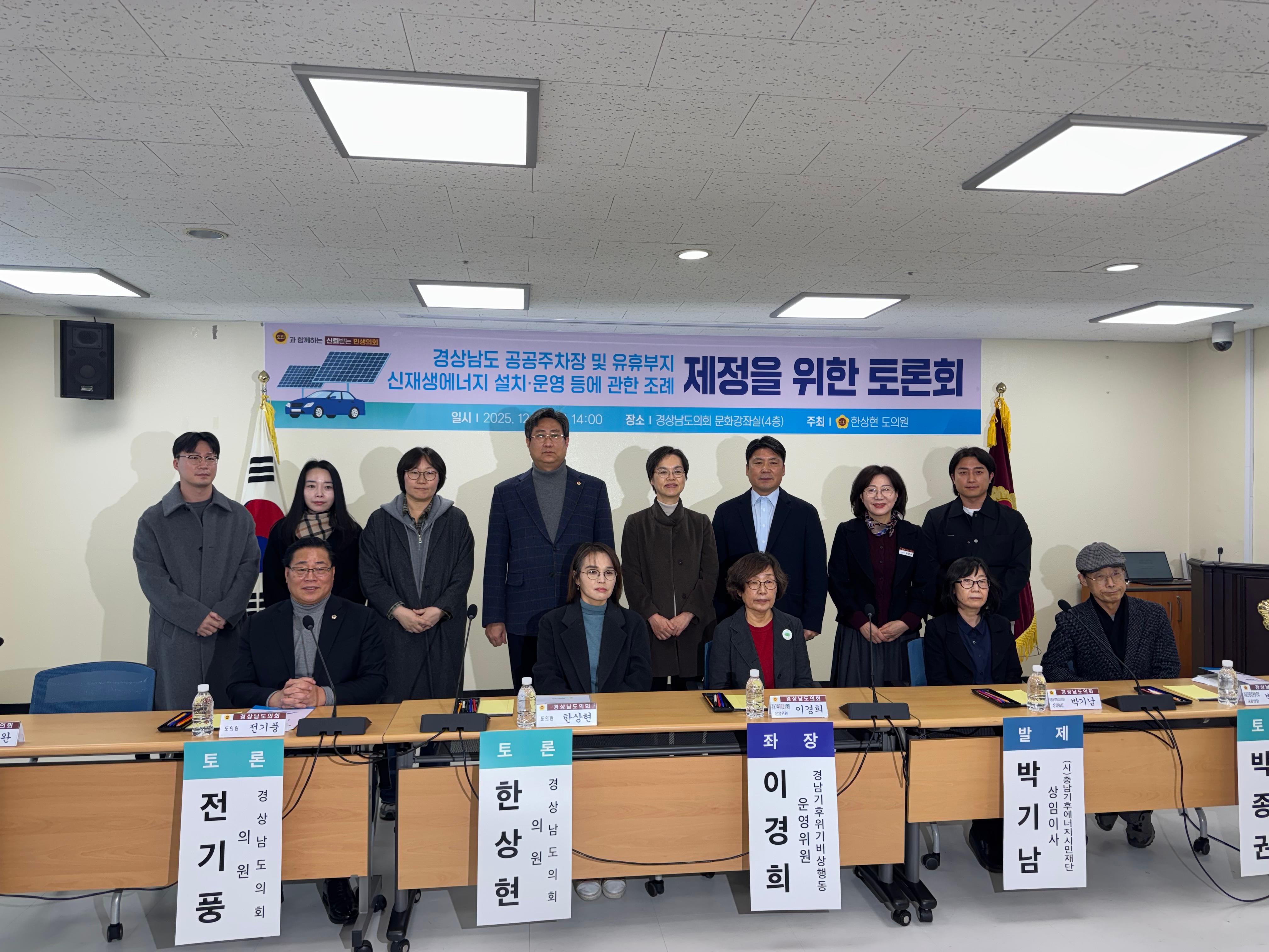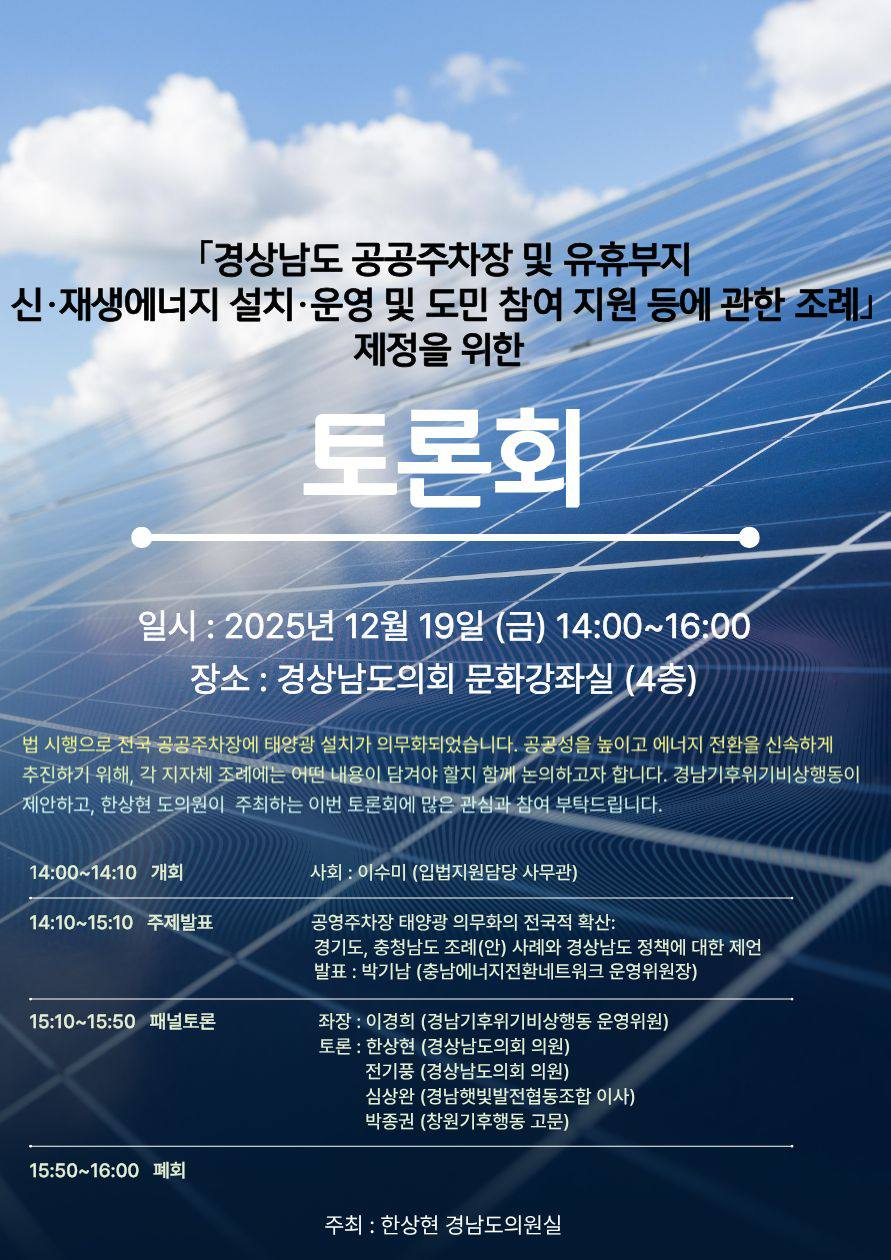 참석한 도민들은 이제 에너지 전환은 이 시대의 필수 과제로 재생에너지로의 에너지 전환에 동의하며 빠르고 강력한 조례 제정을 요청하였다. 경상남도 공공주차장 및 유휴부지 신재생에너지 설치 · 운영 등에 관한 조례는 2026 년 1 월 임시회 때 통과를 준비하고 있다.