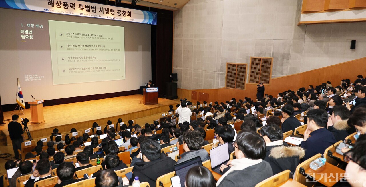 기후에너지환경부(장관 김성환)와 한국풍력산업협회(회장 김형근)는 14일 서울여성플라자에서 ‘해상풍력 특별법 하위법령(시행령·시행규칙) 제정을 위한 공청회’를 개최했다. 이번 공청회는 법안의 핵심인 정부 주도의 계획입지제도, 환경성 검토절차, 주민수용성 확보 방식, 사업자 선정 등을 구체화한 시행령안 및 시행규칙안에 대해 지자체, 지역주민, 어업인, 산업계, 전문가 등 다양한 이해관계자의 의견을 수렴하기 위해 마련됐다.