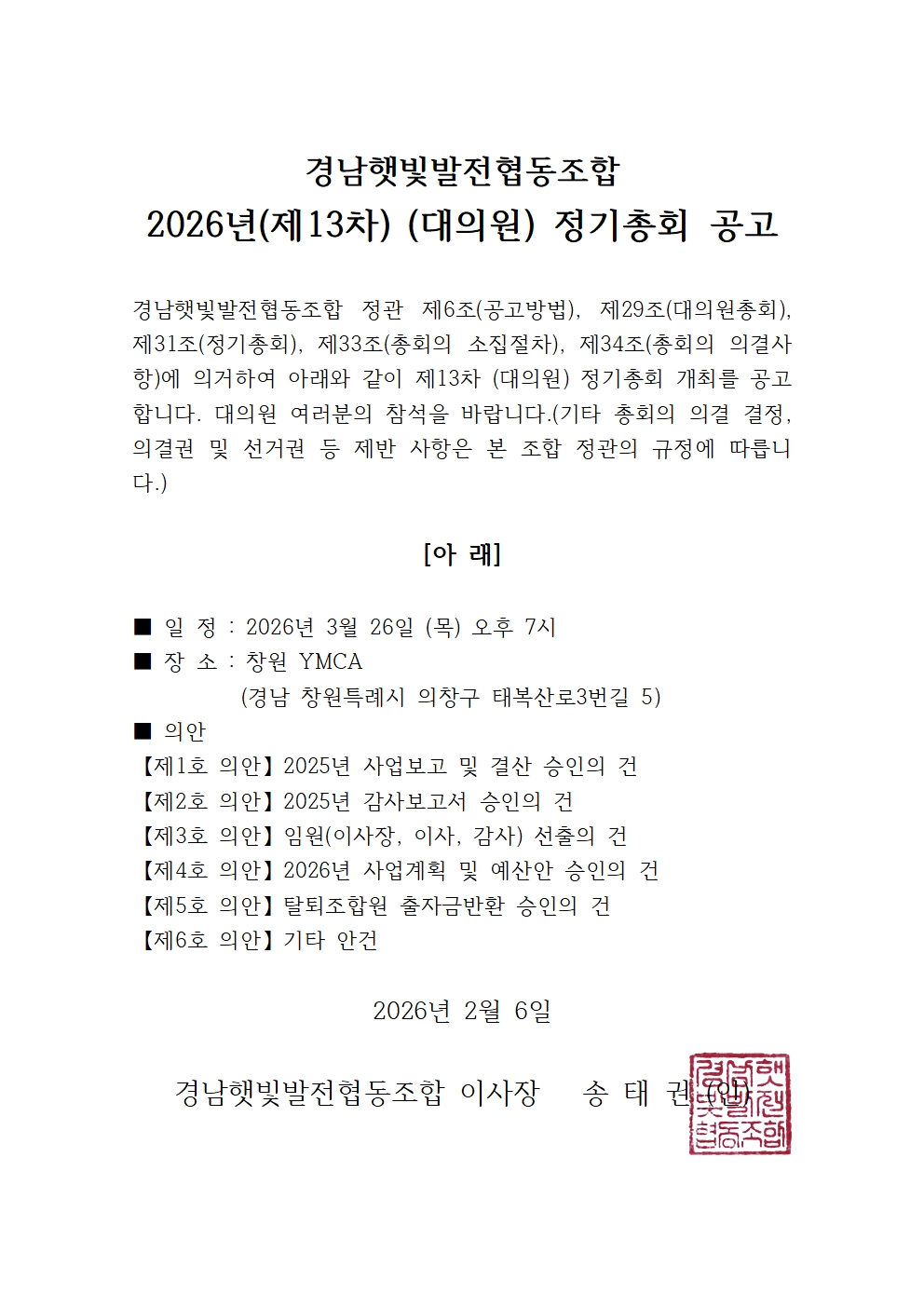 | 경남햇빛 2026(제13차) (대의원) 정기총회 공고 (0) | 2026.02.04 |