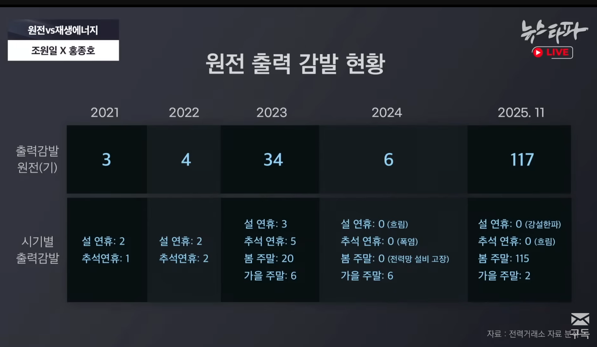 재생에너지와 원전, 미래를 준비하기 위한 중요한 선택이지만 제대로 알고 판단하기 위해서는 문턱이 높은 주제입니다. 다큐 뉴스타파는 '재생에너지 vs 원전 : 공존은 없다' 편을 통해 이 문제를 심도 있게 다뤘는데요. 이 내용 토대로 시청자들의 궁금증을 풀어보는 시간을 마련했습니다. 관련 주제를 탐사 취재해 온 조원일 기자와 복잡한 에너지 문제를 대중들에게 쉽고 편하게 풀어주고 계신 홍종호 서울대 환경대학원 교수가 출연하여 미래를 위해 바람직한 에너지 믹스 정책 방향에 대해 이야기 나눕니다