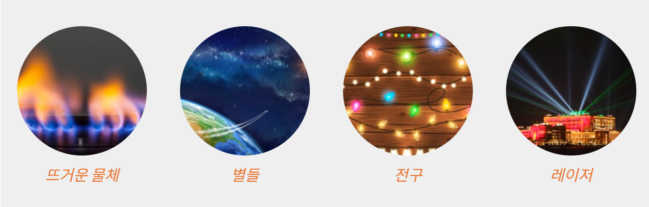 빛 에너지는 별, 전구, 레이저, 뜨거운 물체 등에서 방출됩니다.